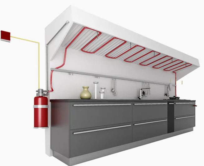 It uses a heat-sensitive detection mechanism installed around the hood. When exposed to high temperatures, the detection element melts, triggering the release of a wet chemical extinguishing agent through the discharge piping.